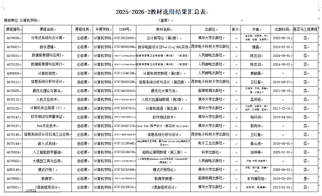 根据《关于启用超星教材管理系统及征订2026年春季教材的通知》,经学院教材建设工作领导小组审议通过,现将2026年春季学期教材选用结果公示如下:公示期:2026年1月9日-1月12日。